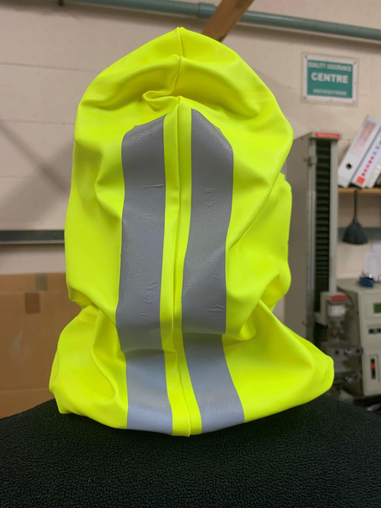 Skyddsoverall med huva och elastiska handleder och en reflexremsa runt bröstet. Sömmarna är helt förseglade, sydda och högfrekvenssvetsade.
